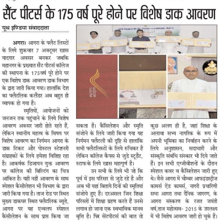 SPECIAL POSTAL COVER LAUNCHED ON 175th ANNIVERSARY OF ST. PETER'S COLLEGE, AGRA